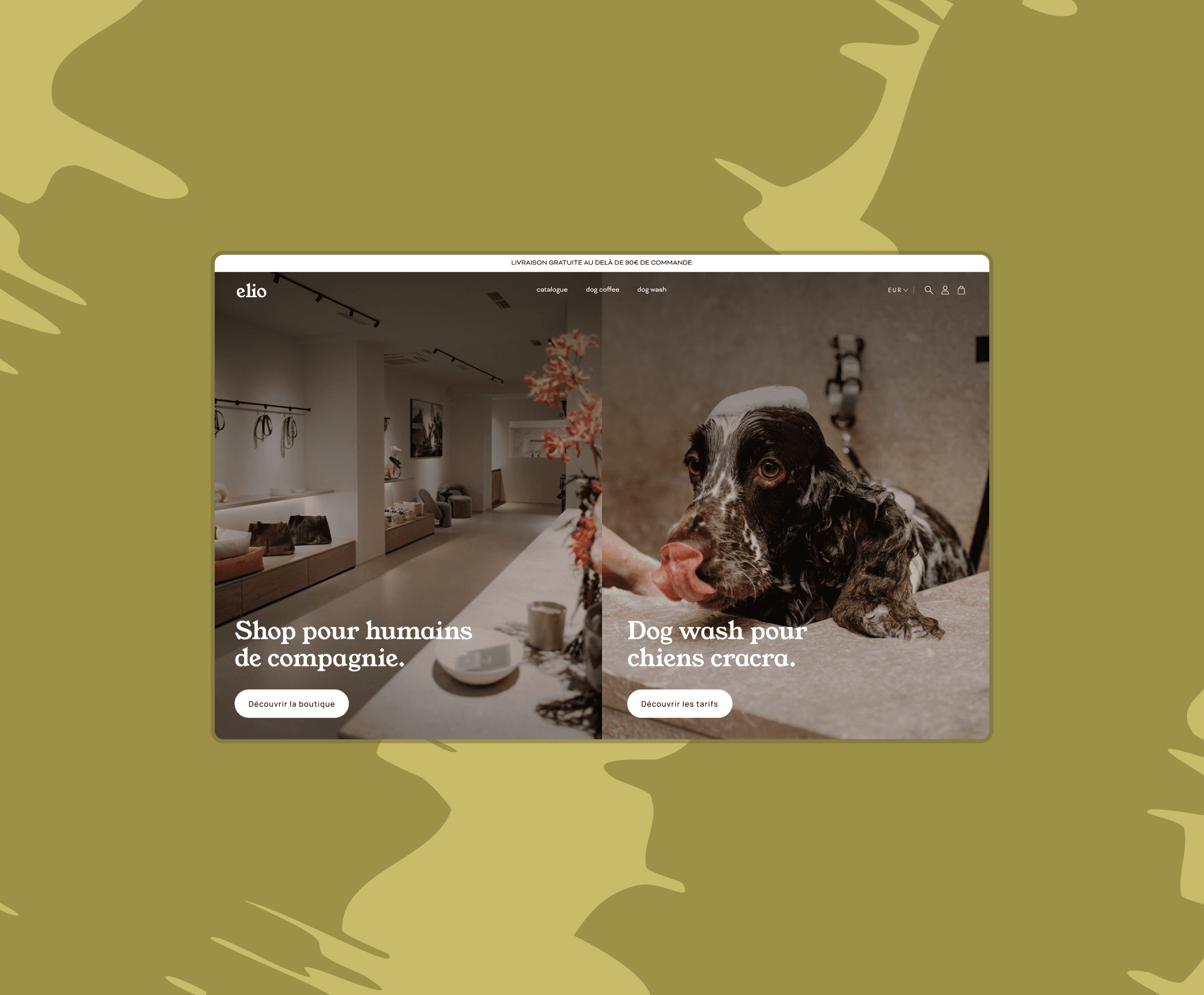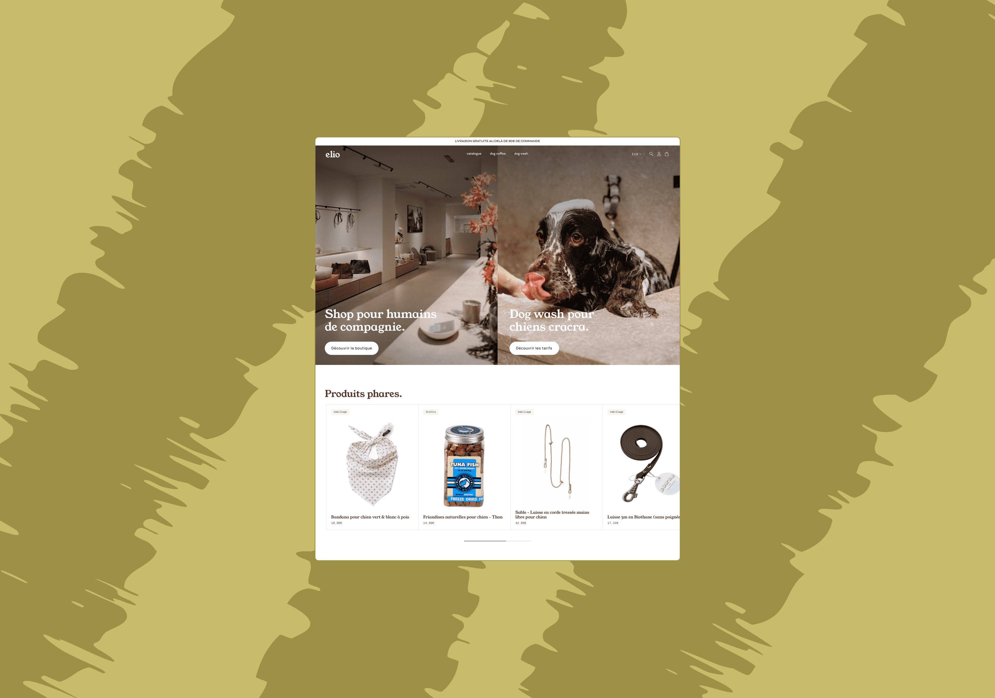 Création de l’identité visuelle, du site web et du concept créatif d’Elio, concept store pour chiens à Nantes. Un univers premium et accessible pensé pour une clientèle exigeante.